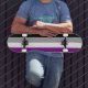 This design features the Asexual Pride flag, which is a symbol of the asexuality (or "ace") community. Asexual people usually do not have deep feelings of attraction towards anyone, no matter what gender they are. Ace people may still have romantic or other social bonds with others, however, unless they are also aromantic. The flag consists of four horizontal stripes: black, grey, white, and purple from top to bottom. The black stripe represents asexuality, the grey stripe representing the grey-area between sexuality and asexuality, the white stripe sexuality, and the purple stripe community.