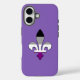 iPhone 16 case with fleur-de-lis (fleur-de-lys or lily flower) symbol with rainbow stripes of black, grey, white and purple from asexuality flag; ace pride design on purple background