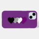Phone case for iPhone 15 case with hearts design in colours of asexuality; black, grey, white and purple, stripes ace pride flag, rainbow love ace pride design on purple background