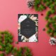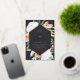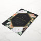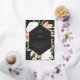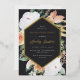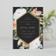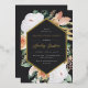 Elegant floral graduation party invitation features an elongated hexagonal frame in stunning gold foil, bordered with watercolor flowers and foliage in boho desert inspired shades of peach, white, ivory, and sage green on an ash black background. Personalise with your grad party details in classic serif and script lettering with foil accents.