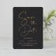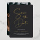 Invite guests to mark their calendars for your wedding with these modern and minimal save the date cards. Simple design features "save the date" in gold foil handwritten script on a soft ash black background, with your names, wedding date, location, and website beneath. Add a favourite portrait-orientated engagement photo to the back.