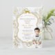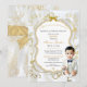 Baby boy in white suit. Invitation background is white satin, gold filigree, a gold and silver glitter frame and bow embellishment. Back is adorned with gold flower pattern & gold ribbon on a white satin background.