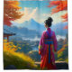 A surrealistic composition of a beautiful Asian woman looking out over and lake surrounded by mountains.