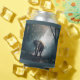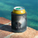 A can cooler with a photograph of an Asian elephant with rounded ears standing in a forest clearing looking towards the viewer with sunlight streaming down through the canopy of trees.