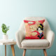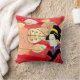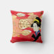Throw pillow is shown with a lovely autumn fall leaves print with a Asian woman in traditional kimono dress.