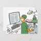 Funny medical cartoon card. An Asian surgeon is about to conduct an operation in an operating theatre and is checking the instructions online via a computer screen. Medical humour.