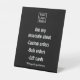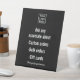 Inform your customers of your specialised services with a business tabletop sign. The display text can be edited to show your desired text. Display text reads: Ask any associate about custom orders, bulk orders, gift cards Thank you for your business. You can replace the display image with your business logo. The sign is black. The text is white.