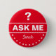 Buttons: Ask ME - ask your questions ? Red button with personalised text / person's name. Help desk assistant, info point clothing button.