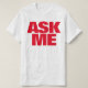 Ask me customer information and help text t-shirt. Great for staff to wear to encourage engagement with potential customers or the public to interact and receive help from the appropriate staff. Reads Ask me on the front and on the back, has a smiling face and the words I am happy to help. Designed by www.mylittleeden.com.
