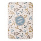 Illustrative surface pattern design of assorted leaf silhouettes in blues, brown and gold on a cream colour background with initial centre to personalise.
