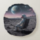 An astronaut in spacesuit sitting in a lawn chair on the moon.