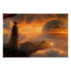 A digital illustration of an astronaut viewing a planet through the viewport of a starship.