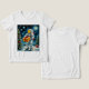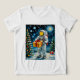 This vibrant design features an astronaut in a full space suit holding a golden gift box, set against a whimsical backdrop of a starry night sky and a festive Christmas tree. The contrast between the vastness of space and the warmth of holiday traditions makes this image both captivating and heartwarming.