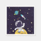 Paper napkins with a dark blue background with yellow stars scattered around. Layered over top is an illustration of a spaceman wearing a white astronaut suit floating above the moon. Waving hello as he explores space. Off in the distance is a planet with rings and a rocket ship flying off into space.