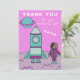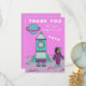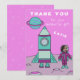 A personalizable birthday thank you card for kids. A girl astronaut on the Moon with her rocket ship. Great for a girl because of the pink and turquoise colour scheme.