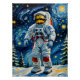 This vibrant artwork captures a fully suited astronaut standing amidst a snowy landscape with evergreen trees, set against a swirling starry sky reminiscent of Van Gogh’s Starry Night. The astronaut’s suit is detailed with American flag patches and red communication wires, reflecting an exploration theme that blends space travel with classic art.