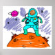 Whimsical childlike drawing of a little kid dressed up as an astronaut.