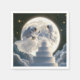 Two astronauts, one in a wedding dress, float near a large tiered cake with the full moon as the backdrop