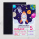 Astronaut, Outer space, Planets Birthday invitation is featured launching a rocket with an astronaut holding a cake and a lot of planets, asteroids, shooting stars, and moon, and at the bottom modern text is used to enhance the elegance of this invitation. Amaze your guest with this easy-to-edit template to make it one of a kind inviatation.