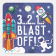 Astronaut Rocket Ship Outer Space Birthday Party Square Sticker that reads "3...2...1...BLAST OFF!" Use for birthday parties, blast off into summer reading programs, and more!