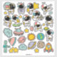 A graphic of astronaut clipart, Outer Space: astronaut holding balloon as a planet, a rocket, stars, UFO icon, Space satellite icon, Saturn planet, Spaceship, and others.