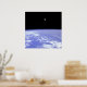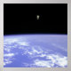 Mission Specialist Bruce McCandless II, is seen further away from the confines and safety of his ship than any previous astronaut has ever been. This space first was made possible by the Manned Manuevering Unit or MMU, a nitrogen jet propelled backpack. After a series of test manoeuvres inside and above Challenger's payload bay, McCandless went "free-flying" to a distance of 320 feet away from the Orbiter. This stunning orbital panorama view shows McCandless out there amongst the black and blue of Earth and space.