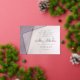 This geometric style wedding invitation is simple but elegant with muted plum / grey colour theme with calligraphic elements, asymmetric frame and custom text accents in real rose gold foil, and a marble texture appearance - by katz_d_zynes
