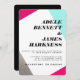 Asymmetrical wedding invitation featuring a retro design in black, white, hot pink, turquoise and silver.
