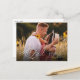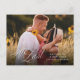 An elegant save the date postcard featuring the words “at last” in a fancy script and personalised with your details and photo.