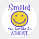 Put a human face on Atheism with a bright yellow face outlined in blue with blue letters that says: "Smile! You just met an ATHEIST."