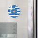 The national flag of Greece acts as a background for the Athens coat of arms which is infused into a circle shape.