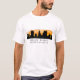 T-shirt design features Atlanta Georgia city skyline silhouette with sunset watercolor splash and latitude & longitude map coordinates