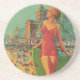 Vintage illustration United States of America travel poster art for Atlantic City, New Jersey via the Pennsylvania railroad featuring a beautiful blonde pin up woman in a bathing suit holding a towel looking up at the sun on the beach during the summer. People are having fun on the beach and boardwalk. Atlantic city is a resort city known for it's gambling, shopping and fine dining.