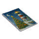 A festive lobster trap tree decorated with buoys and lights stands by a snow-covered lighthouse under a starry sky. Inspired by Christmas in Maine.