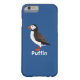A digital painting of an Atlantic Puffin. Text reading "Puffin" also appears. The Atlantic Puffin (Fratercula arctica) feeds primarily by diving in the water. They breed in large colonies on coastal cliffs or offshore islands in the North Atlantic. They shed the colourful outer parts of their bills after the breeding season, leaving a smaller and duller beak. Their short wings are adapted for swimming with a flying technique under water. In the air, they beat their wings rapidly (up to 400 times per minute) in swift flight, often flying low over the ocean's surface.