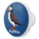 A digital painting of an Atlantic Puffin with text reading "Puffin" on a blue background. The Atlantic Puffin (Fratercula arctica) feeds primarily by diving in the water. They breed in large colonies on coastal cliffs or offshore islands in the North Atlantic. Puffins shed the colourful outer parts of their bills after the breeding season, leaving a smaller and duller beak. Their short wings are adapted for swimming with a flying technique under water. In the air, they beat their wings rapidly (up to 400 times per minute) in swift flight, often flying low over the ocean's surface.