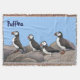 Puffins at rest on the rocks. Customisable text reading "Puffins" also appears. The Atlantic Puffin (Fratercula arctica) feeds primarily by diving in the water. They breed in large colonies on coastal cliffs or offshore islands in the North Atlantic. Puffins shed the colourful outer parts of their bills after the breeding season, leaving a smaller and duller beak. Their short wings are adapted for swimming with a flying technique under water. In the air, they beat their wings rapidly (up to 400 times per minute) in swift flight, often flying low over the ocean's surface.