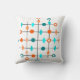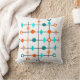 This throw pillow has mid-century modern design of a grid in black lines with orange and teal circles and diamonds.