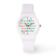 This watch has mid-century modern design of a grid in black lines with orange and teal circles and diamonds.