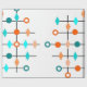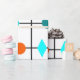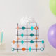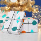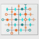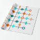 This wrapping paper has mid-century modern design of a grid in black lines with orange and teal circles and diamonds.