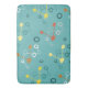 This atomic era-inspired abstract pattern has lines and circles connecting. The colour scheme is turquoise blue-green, dark teal, bright yellow and orange.
