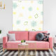 A unique mid century modern abstract art design with pale yellow orange and blue colours and shapes like space age planets and starbursts.
