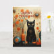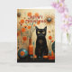 Fun Christmas card for the person that loves anything retro. Black Cosmic Cat with Sputnik shapes, turquoise and orange ceramic vases and orange