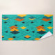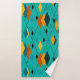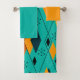This towel set has a gold washcloth, a turquoise hand towel, and a bath towel with a mid-century modern atomic design of diamonds, and starbursts on a field of turquoise.