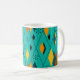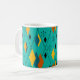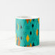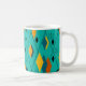 This mug has a mid-century modern atomic design of diamonds, and starbursts on a field of turquoise.