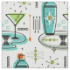 My original vector illustrations of atomic fifties inspired martinis, shakers, olives, and more, in green, pimento, aqua, gray, and black on an ivory background. ©Christine Duffield 2020