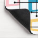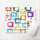 This mouse pad has a design of rectangles that are stretched on one end in groovy colors, orange, green, teal, purple, blue, pink, and yellow with atomic lines crisscrossing them.