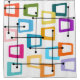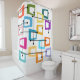 This shower curtain has a design of rectangles that are stretched on one end in groovy colours, orange, green, teal, purple, blue, pink, and yellow with atomic lines crisscrossing them.