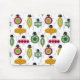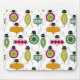 This mouse pad has a mid-century modern Christmas design of ornaments with grey stars layered behind them.