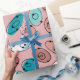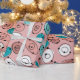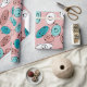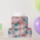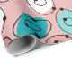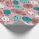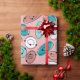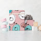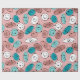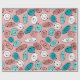This wrapping paper has a mid-century modern atomic design of oval outlines with small circles on them and solid coloured ovals inside them.
